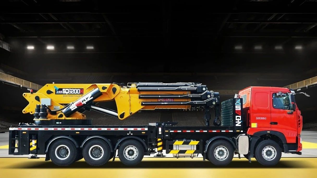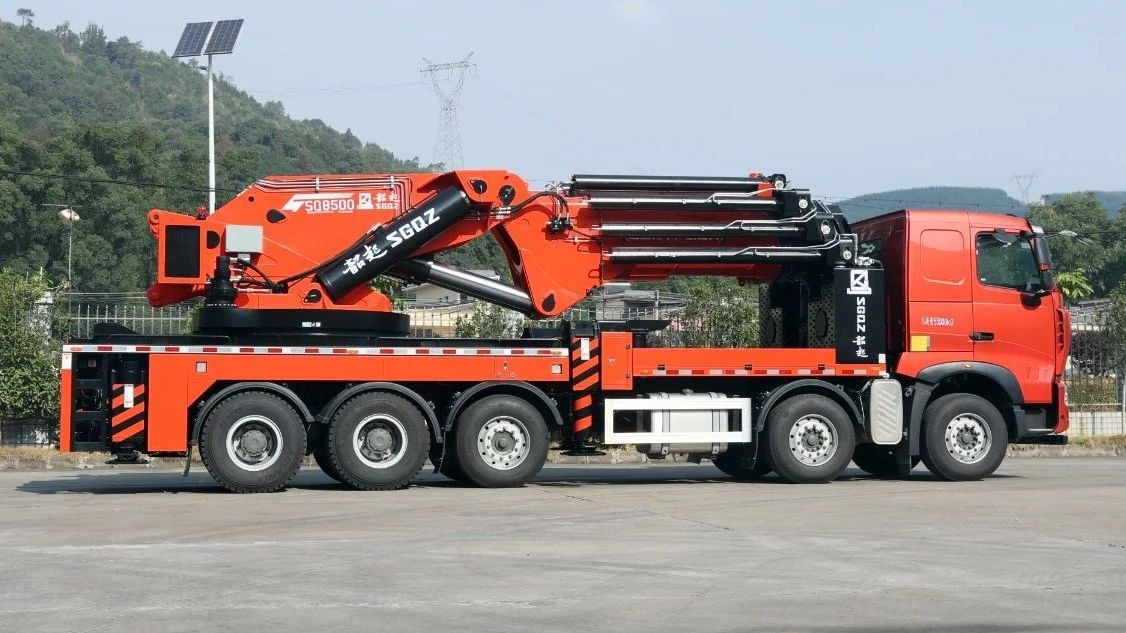 最大吨位全折臂SQ80T,公告总质量53吨,整车自重41吨,整车长度12米,吊臂全折叠后,车厢前部空间7米2,装配重、装平台、装设备、装10吨叉车等等都很方便。最大测试起重68吨,八节臂全伸可吊载8.2吨,整体式车架设计,正侧方最大测试起重50吨,可仰推12吨货物到23米高,采用进口大流量电液比例负载敏感多路阀、高压大流量变量泵、进口大流量电控再生阀,精选匹配的液压回转装置、平衡阀、液压锁、高压过滤器等液压元器件,进口带显示屏遥控器,便捷控制功能动作,实时显示吊载数据;高精度力矩限制系统,具备整车防倾翻、防碰撞虚拟墙、超载声光报警功能,吊载更安心。