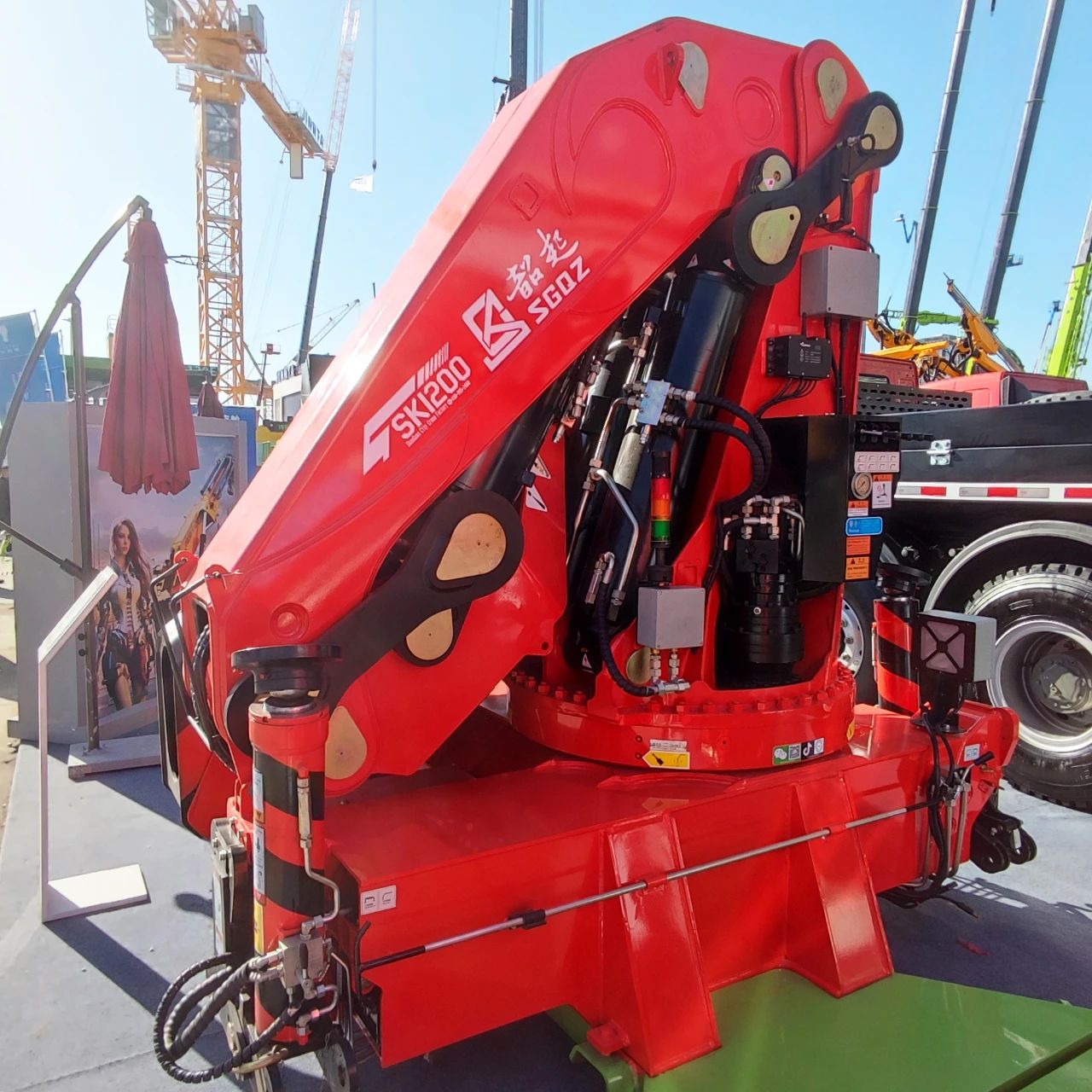 出口定制款全折臂SK1200,十节液压伸缩臂,全伸臂最大工作幅度22.9米,最大起重力矩94.7吨米,整机自重10.8吨。